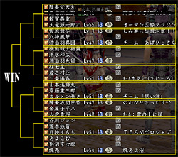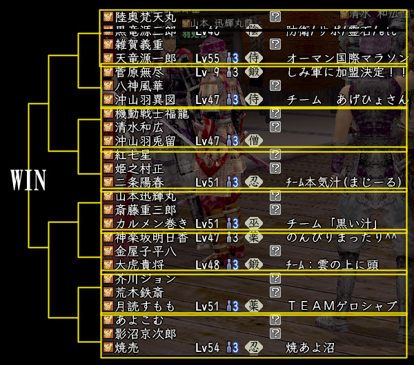 まぁ見にくいけど、対戦は右の通り(クリックしたらちょっとデカイ画像が見れます)。徒党編成なりレベルなり、かなりバラバラですが、勝ち負けではなく、対人を楽しんでほしかったので良いのです。