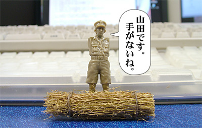 というわけで、今回はあげさんに登場してもらい、ワラ束サイズを調べてみて、ワラ束を作ってみましょう。そう。あの岡陣を守るもっとも重要な要素というべき、あのワラ束です。
