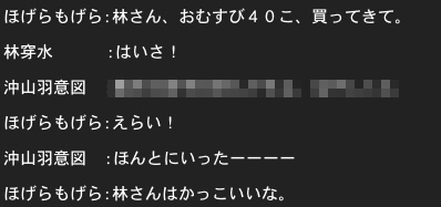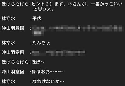 さらにグダグダしていると、どこからともなく林さんが現れました。SS撮ってないのが非常に残念なのですが、とりあえずチャットログから会話を掲載させていただきます。