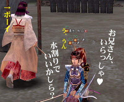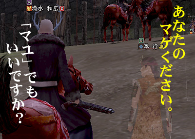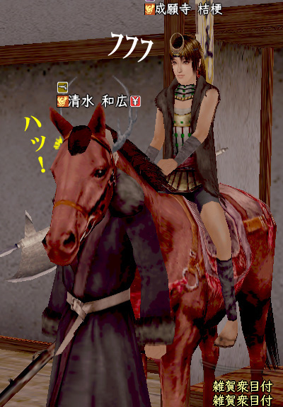 そういえば、写真は省略しますが、今回、掲示板前の橋でペア狩りされたのはヤだったなぁ。お相撲さん化粧の忍者と鍛冶屋の武田家老さん。別にキミらがソロで来ても勝てるんだから、そんなにいじめなくてもいいのにねー。今度やるときは、うちのおとのさま(侍/29)とペアで返り討ちにしてくれるわ〜〜〜!わははは!(ちょと自虐的)