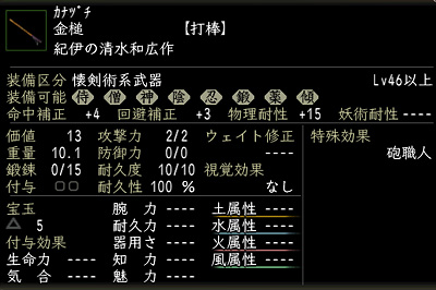 42本作って、このほかにも「忍者刀」「棍棒」「弓」「具足」で、計5本ほど特殊効果が付きました。ふむ。率的には約12%かぁ。さらに欲しい特殊効果が付くのは1/22・・・・今回は神様のおかげで何とかなりましたが、難しいですねぇ。職人装備は。