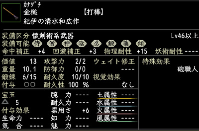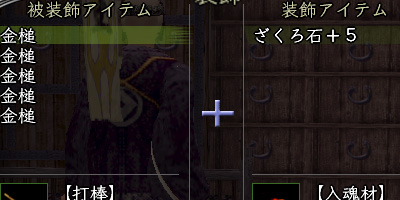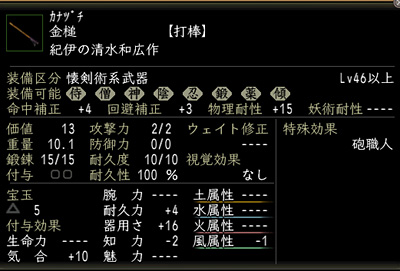 快く引き受けていただき、牛毛筆と樫柄をゲット。堺に帰って牛毛筆で祈祷札を作ります。樫柄は42本作っていただきましたので、それに合わせて金槌を作ってみることに。もちろん、目指すのは「砲職人」効果の付いたものです。