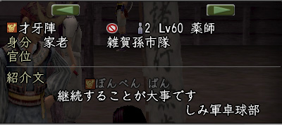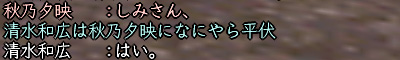 - パリスさん、屯所の人。奈良にいた彼女を清水が対話で郷に呼び寄せたんです。で、メンバーはパリさんが最後だったので、清水も清香(清水の2垢の刀鍛冶)に変わってパリさんを勧誘。そして陸2に移動して最初の魔鬼と戦闘開始。戦闘後しばらくしてパリさんがひと言「あれ?しみさんは?」・・・・ふむ・・・まぁ、まだまだ知名度が低い清香なのでした。【↑戻る】