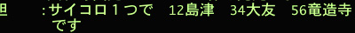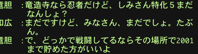 ですが、古参だからといってボクらに対して「何してんねん」ってトコロはなく、徒党中の会話も、なにやら豆さんと三国志なネタでキャッチボールする感じ。ボクが思うに、うずめさんは少し天然系入ってると思います!これからもよろしくお願いいたします。かしこ。【↑戻る】 - この日のびーさんは、幾度となく一休さんに「人の話を聞かない」「人の話を聞かない」と、小学校の先生が生徒を怒るような感じで注意を受けていました。【↑戻る】