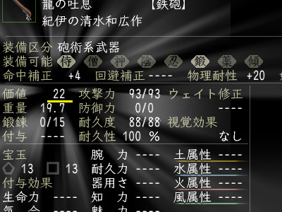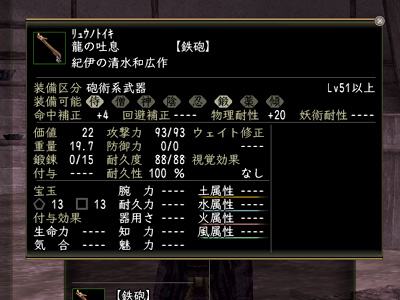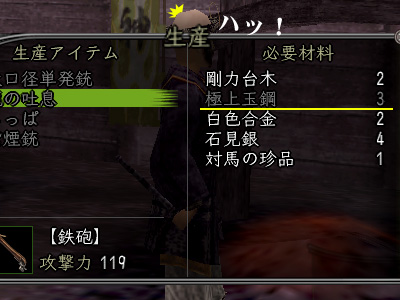 この鉄砲、標準で119です。まぁ、少ないながらも潜在は全て鉄砲振ってるし、少しはイイもの作りたいですねぇ。再度、炉の神様にお祈りして生産開始。