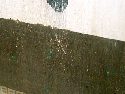 実はこの掛け軸風レトロ看板、結構芸が細かくてですね、裏打ち(?)には花模様も入れてます。