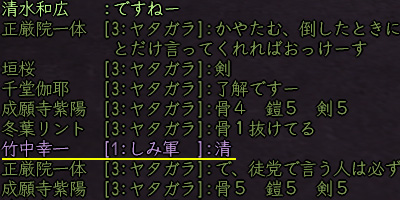 あー、ちょっと話が飛びますが、先日、明勝さんと一瞬だけ徒党を組んだんですよ。郷に来てた他国の人の玄武若クエの手伝い徒党で。