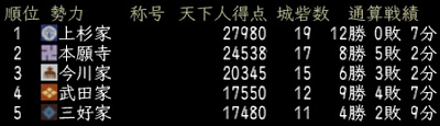 ある時期が来ると、この番付表で上位2勢力による「天下分け目の大合戦」が行われます。そしてその勝利勢力が天下統一って感じになり、1クール終了になるようです。