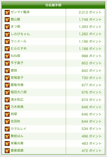 具体的には「逆茂木」「固定大砲」「伏兵襲撃」(いわゆる密書届け)「武将奮起」です。それぞれ完成したり達成したりすると200〜500の戦果がプラスされます(個人恩賞ポイントは1回運ぶごとに+1)。