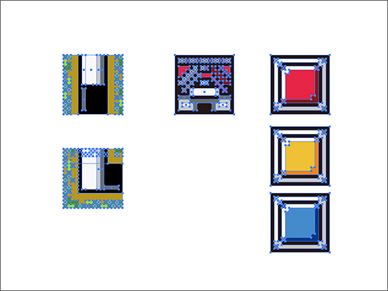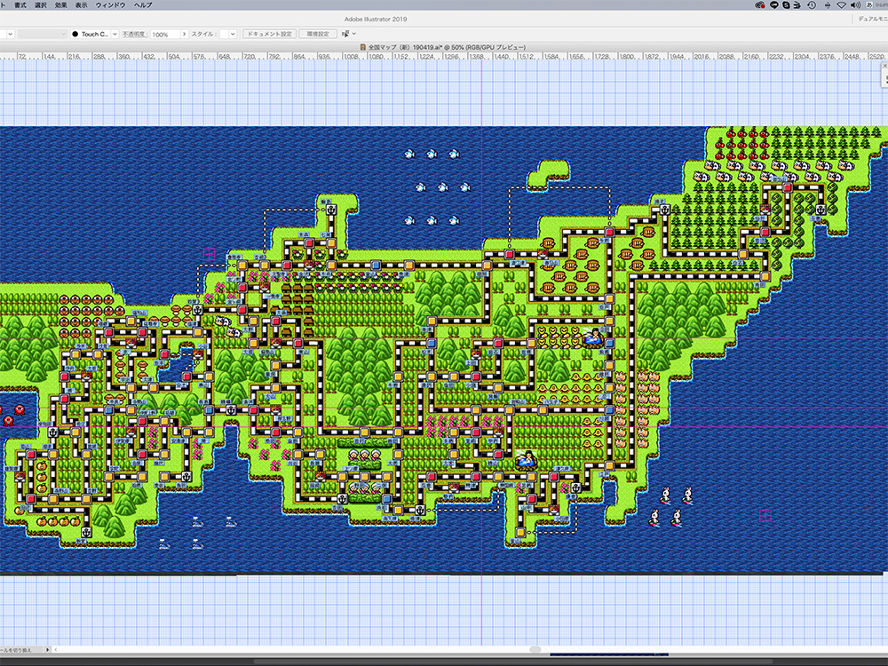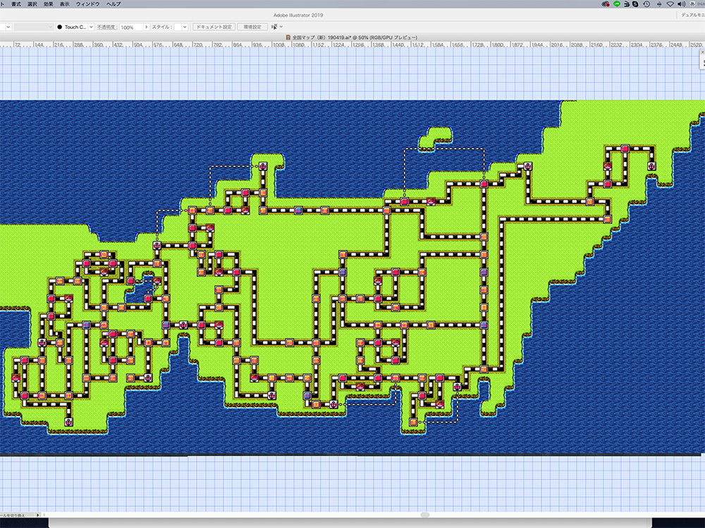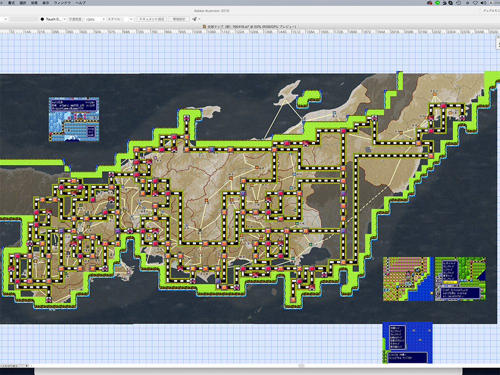 今回は「当時の桃鉄の雰囲気をできるだけ再現したい」という点にこだわりたいので、ネット上に落ちてるゲームの画面画像を利用して、すべてイラレでドット作りです(ちなみに今回参照したのは桃鉄DXってやつ)。