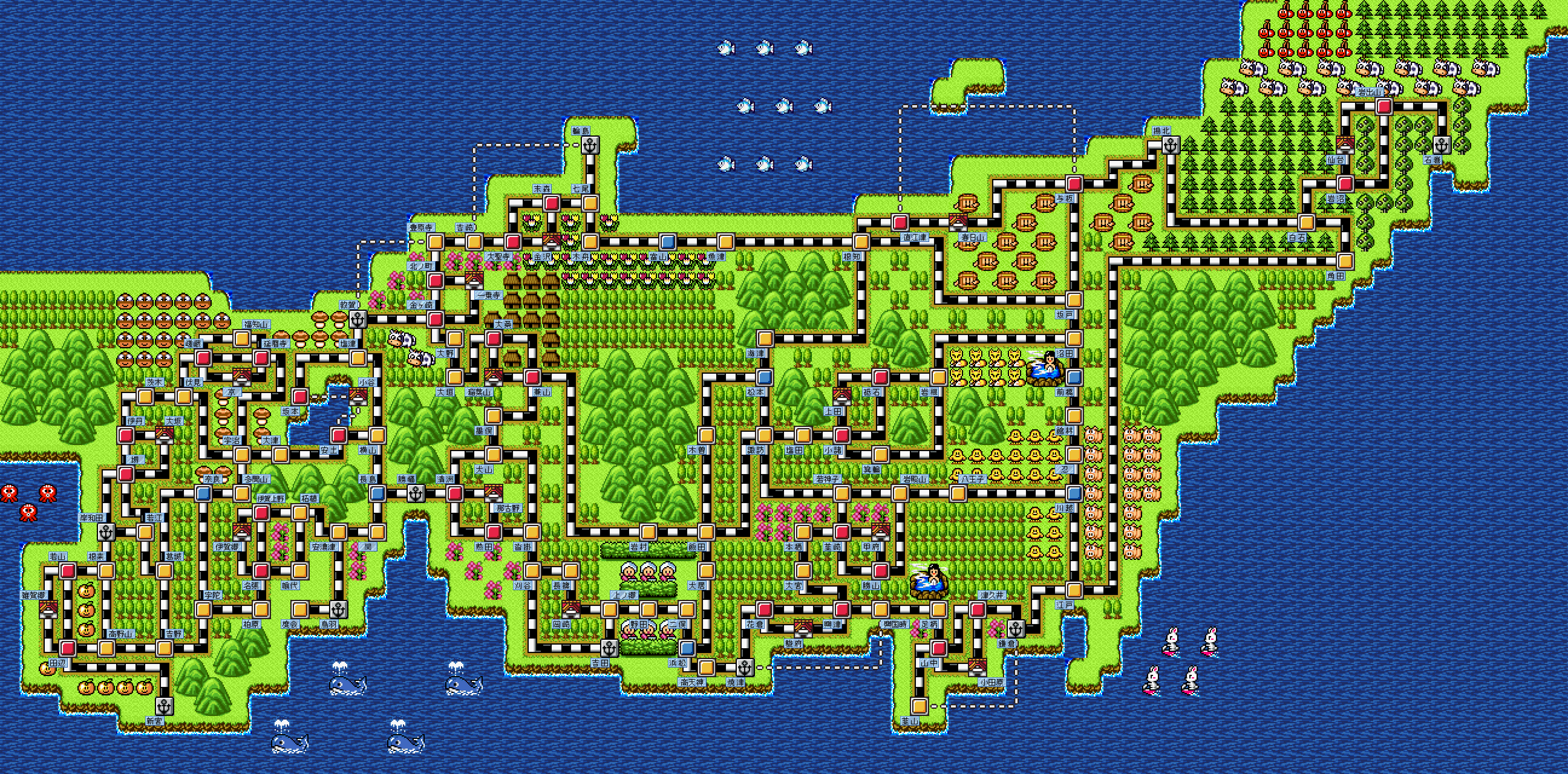最初の画面が「海」なので判りにくいですが、マップ画像をドラッグするとスライドします。するとそこには、まるで桃鉄での「マップ確認」のような世界が広がるのです!(Chrome/Safari/Firefoxで一応動作確認)