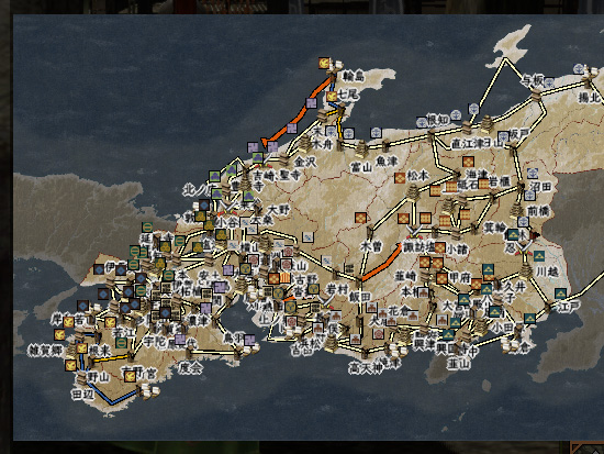 ちなみにイメージとしては、外郭都市が黄色、中核都市が赤、本城が城アイコンと青です。