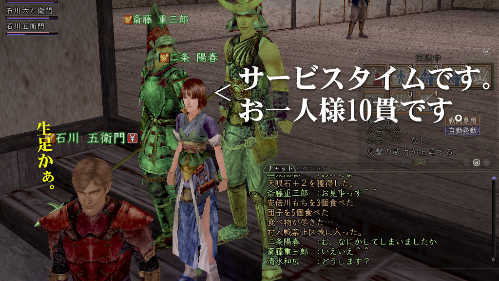 土曜日は昼すぎから少々仕事が入ってたので、インしたのは20時半くらい。市も会議もすっかり忘れててあげさんで採集してたのですが、22時前くらいに思い出してしまったので、清水を呼び出して雑賀砦へ。