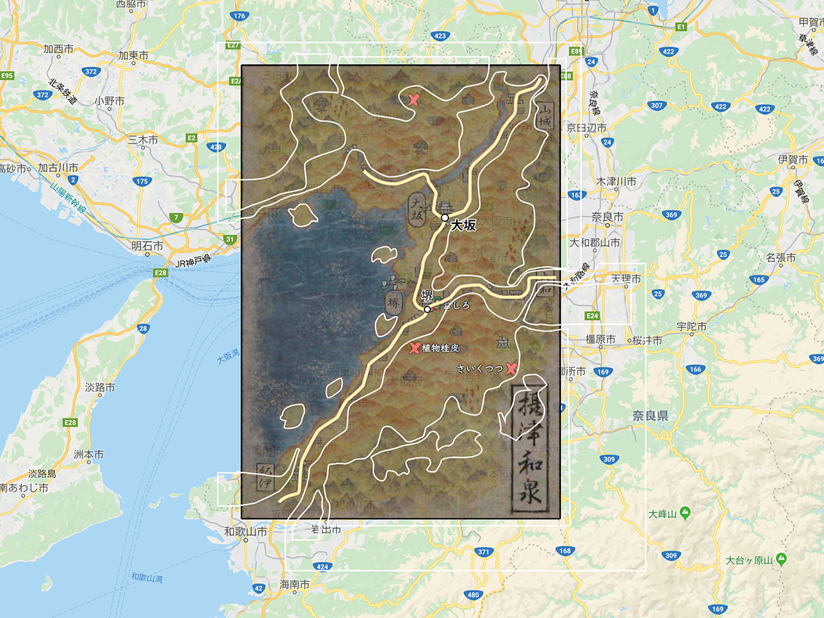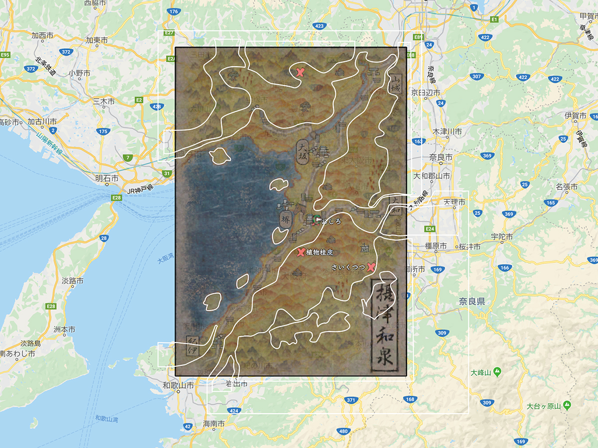 まずは大阪湾を中心に、実際のGoogleマップと信onの地図を重ねます。