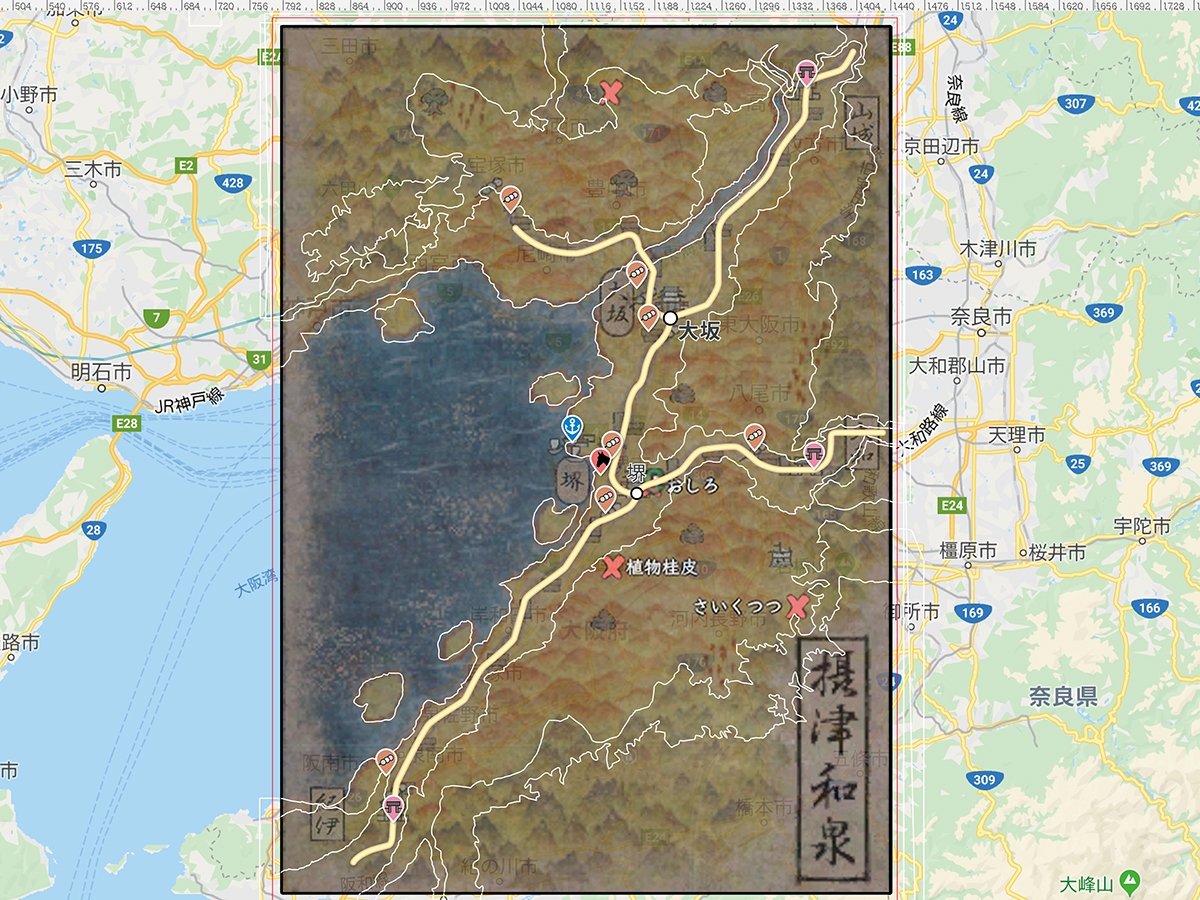 摂津和泉には、フィールド内に「有馬温泉」「ススキ野原」「恵比寿天」「大魚夜市」「住吉神社」などの観光名所がありますので、それらもマーキング(ついでに廃城も)。