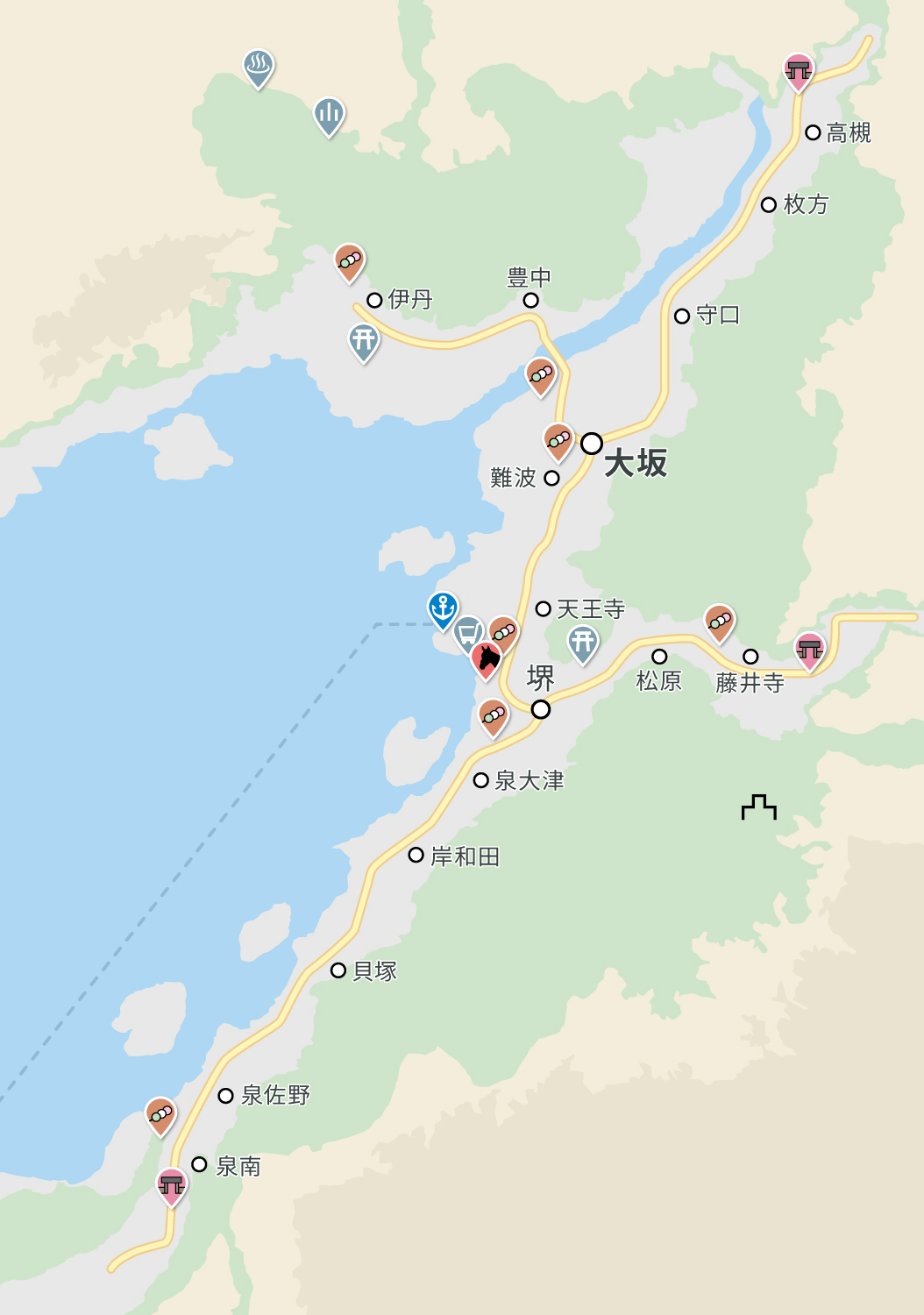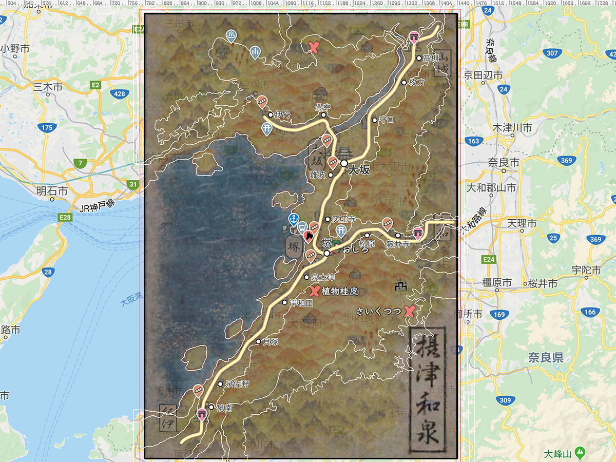 そんで、道をつけて、大坂・堺の都市をポイント。