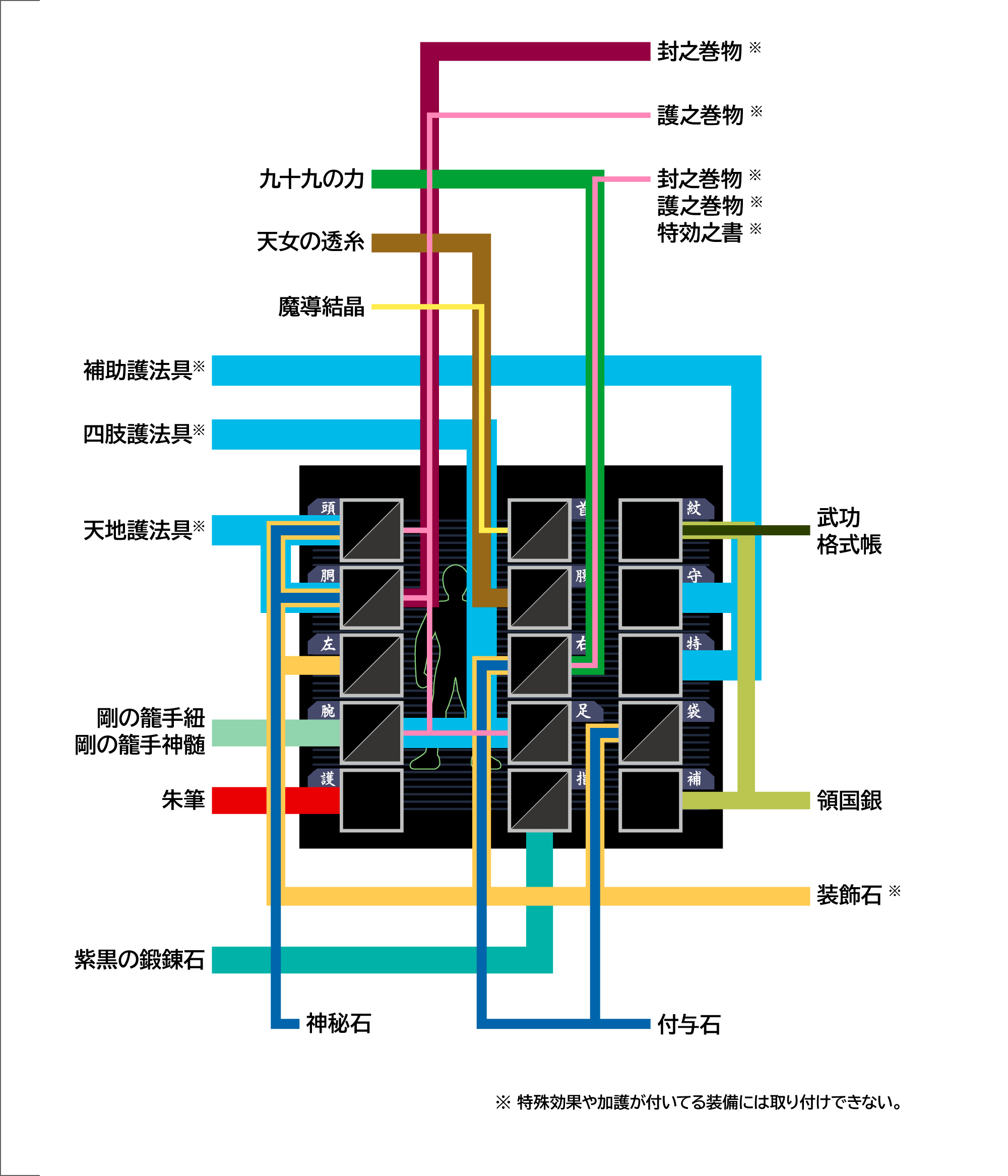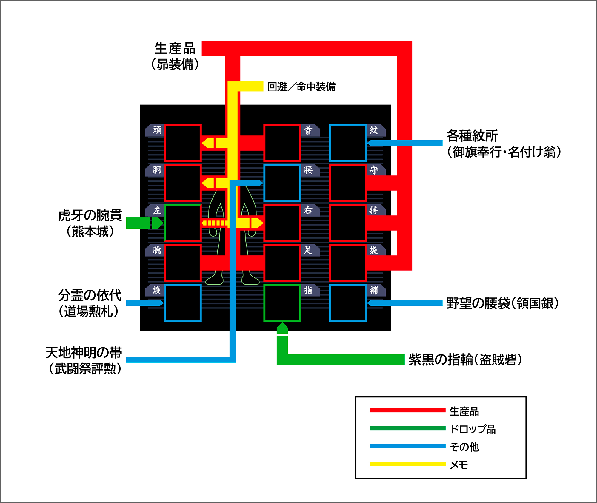 数値云々はさておき、現状各装備の入手(?)方法としてはこんな感じかな(クリックすると拡大画像)。