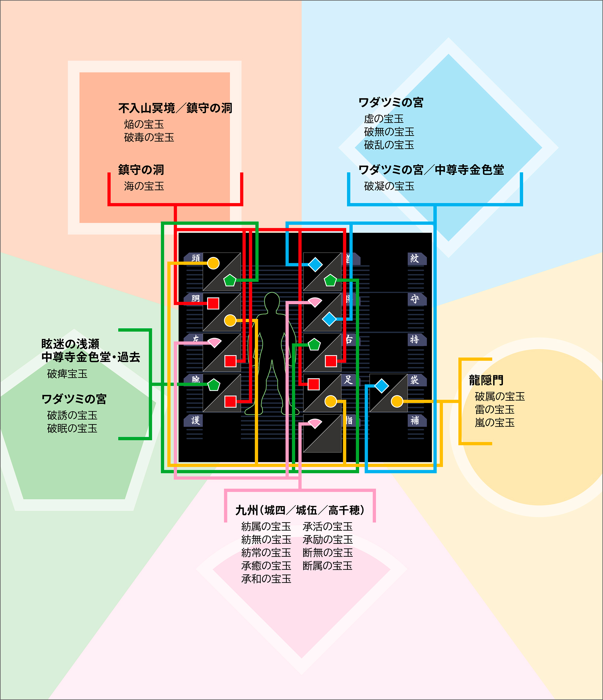 ついでに各宝玉の種類と入手先も表示してみる(クリックすると拡大画像)。
