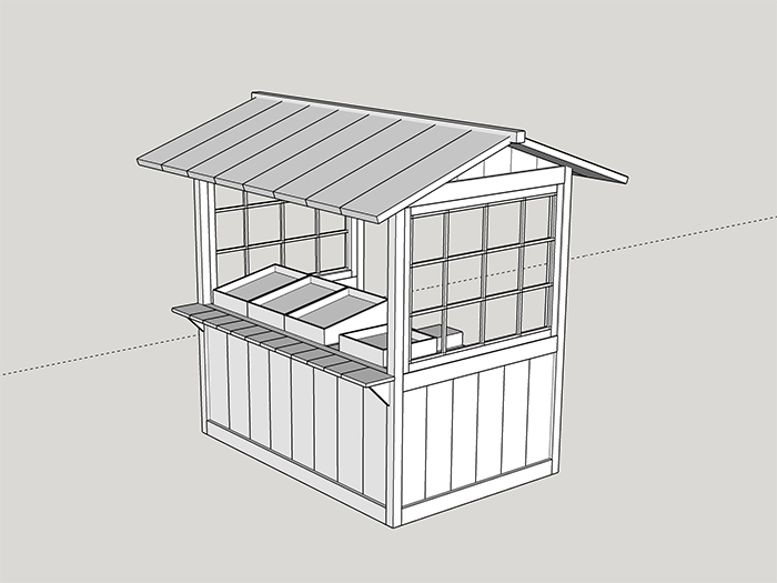 「現実に即した」というのは、例えば四隅の柱のサイズ、最初は100mmで作ってましたが、ホームセンターに行ったら8mmしか売ってなかったので80mmに変更するとか、そういう生々しい感じ。