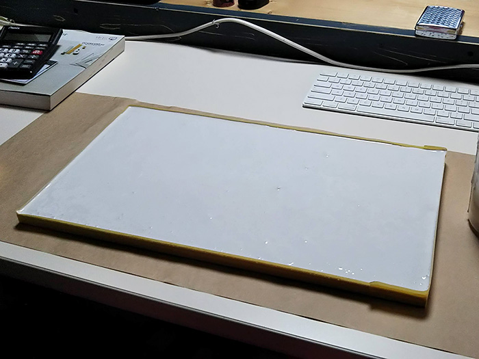 段取りとしては、Pカッターみたいなやつで1/3〜1/2くらいまで筋を削って、あとは〝ペキッ〟って感じで折るそうなのですが、その厚さを削るのが大変です(カッターもすぐに熱くなる)。