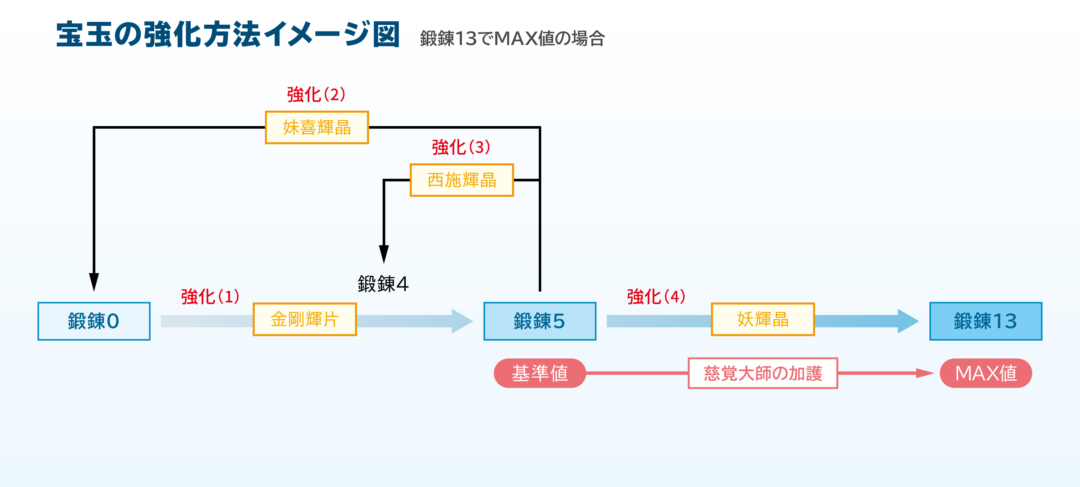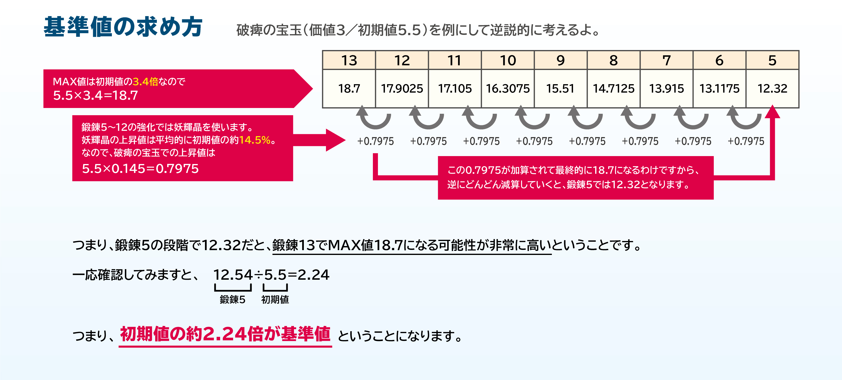 鍛錬5以降は鍛錬13まで8回強化できます。その際の〝妖輝晶〟の上昇値の平均が約14.5%、各宝玉のMAX値が初期値の3.4倍(340%)ですので、基準値は初期値の2.24倍となります(340-14.5×8=224)。