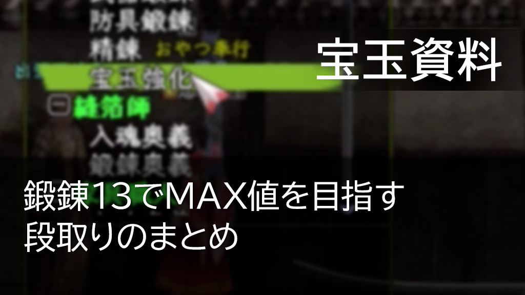 そこで「復帰してちょっと経ったし、本気宝玉を作ってみるか」って方や、既存ユーザの方で「装備作りも一段落したから本気宝玉を作ってみるか」って方を対象に、鍛錬13で上限値(MAX値)になる宝玉作りの段取りをまとめてみました。