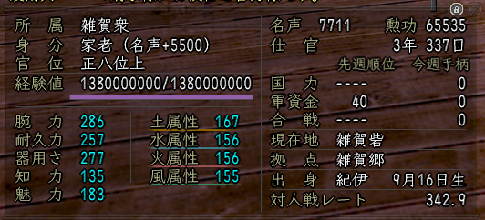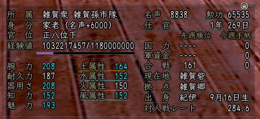 ボクは一応家老だし、孫市隊の中で一番を取ると筆頭寄騎アイテムを貰えるってことかぁ・・・などと思って自分のステを表示させてみると、