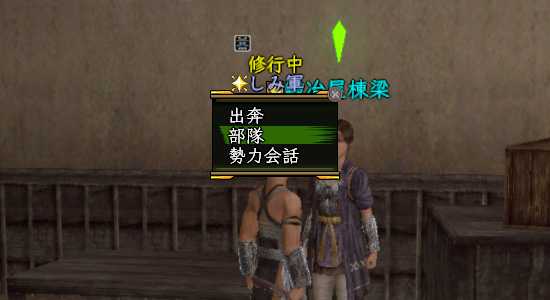 部隊に配属されるためには自国の寄合所の長に話しかけ、[人事]-[部隊]-[部隊]-[変更希望]を選びます。