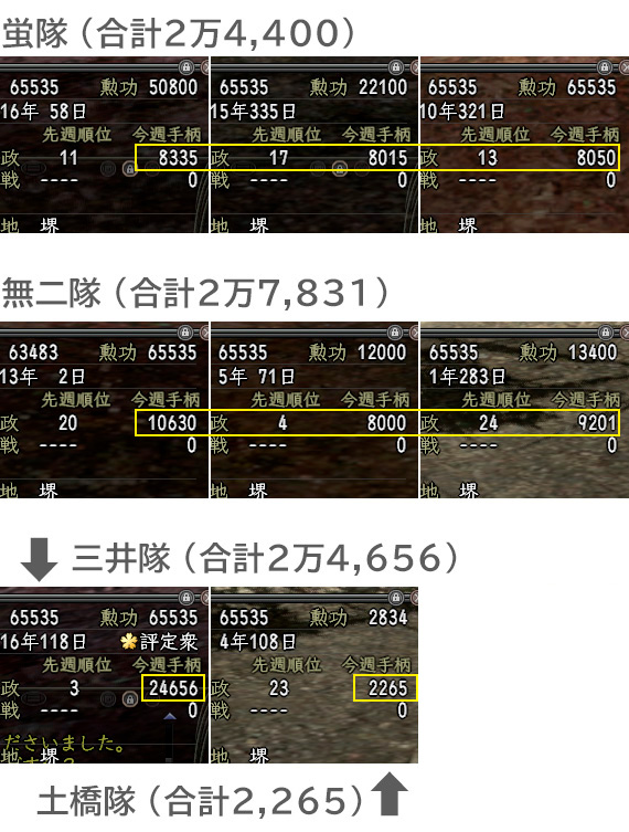 蛍・無二隊にはそれぞれ3人入れてますので、手柄合計はちょうど1万8,000位。うん、部隊としての目標に到達しそうです。