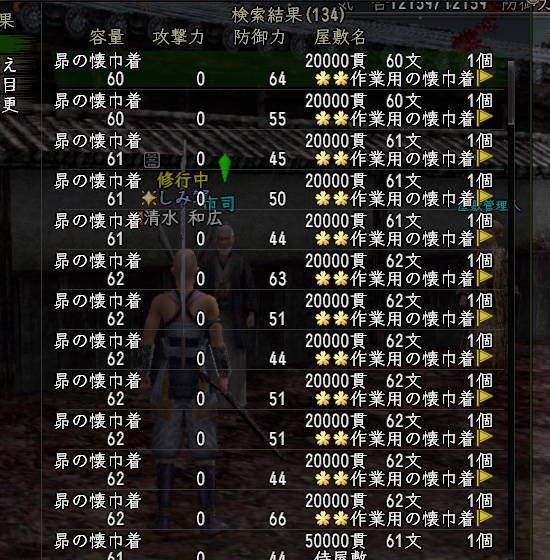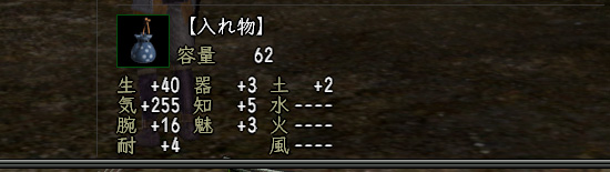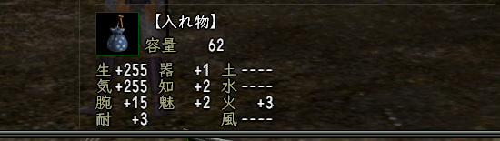 付与石を入れないもしくはクズ石付与を前提に、荷物が多くなりがちな旧ダンジョンや採集での使用を目的とした、「容量が60以上」「気合がほぼ255」「腕力6以上」だけは統一してる袋です。今朝までで3つか4つ売れたかな。