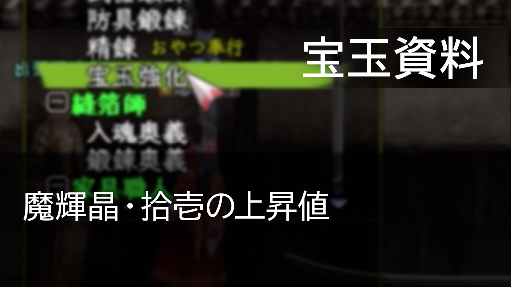 以前「金剛輝片の上昇値」や「妖輝晶の上昇値」について調べた際、どの宝玉についても上昇した平均的な値は初期値に対する割合がほぼ同じでしたので、〝魔輝晶・拾壱〟でも同じ上昇仕様だと考えると、1回の強化で初期値の4.6%程度上昇するといえそうです。