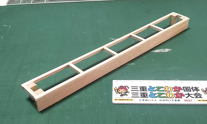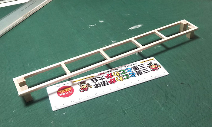 昨日作ったはしご状の物体に、7mmの角材を20mmでカットしたものを「足」として取り付けます。