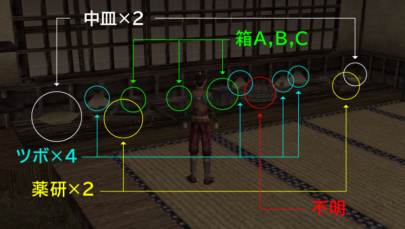 | 作業台 | 中皿 | 中皿 | 箱A | 箱B | 箱C | ツボ | ツボ | ツボ | ツボ | 薬研 | 薬研 | 不明 |