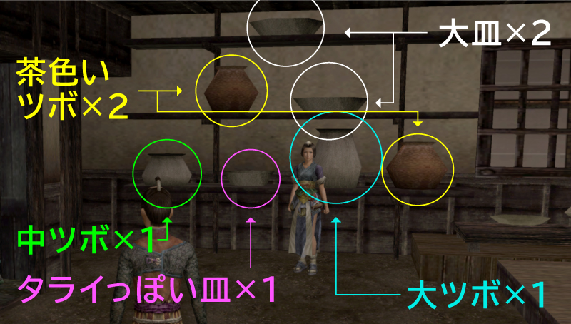 | 棚 | 大皿 | 大皿 | 茶色いツボ | 中ツボ | 大ツボ | タライっぽい皿 |