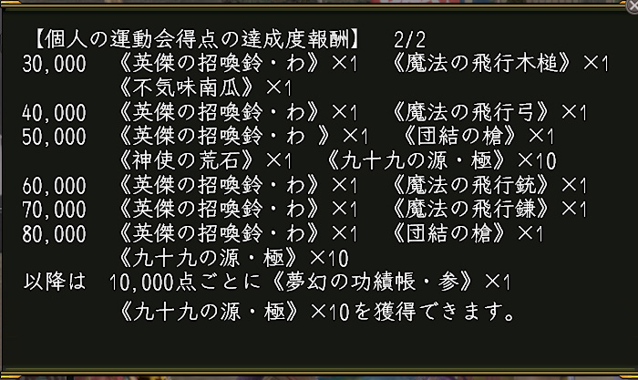 初回報酬が8万点までで、以降は1万点ごとにアイテムをもらうことができるようです。