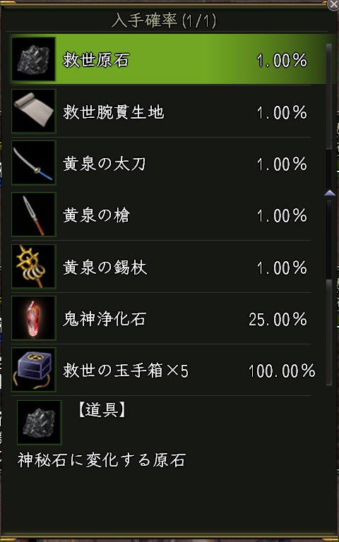100%の確率で5個もらえる〝救世の玉手箱〟というのは、60個集めることで入手確率1%のアイテムと交換できる、というものです。