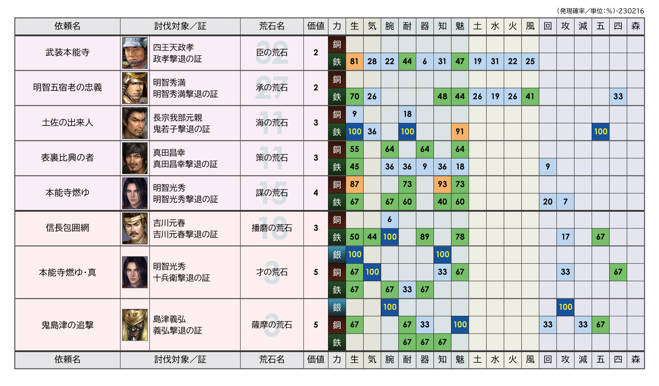 簡単なものではございますが、ここ最近の週間獲得可能な〝鬼神石〟のステータス発現率について画像でまとめてみました。
