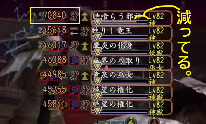 - この動画の時喰らう邪神の生命力が、他の動画の時喰らう邪神の生命力より70,840少なかったので、(1)の攻撃が通ってたことになる