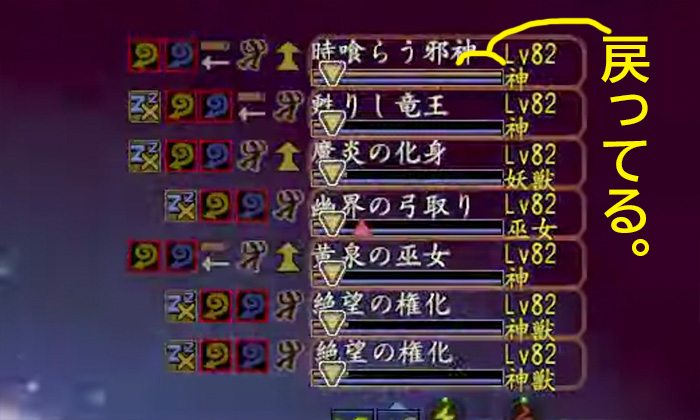 - 破壊神罰を発せられる直前の誾千代の攻撃が、数値としては表示されなかったが時喰らう邪神の生命力のバーが減った