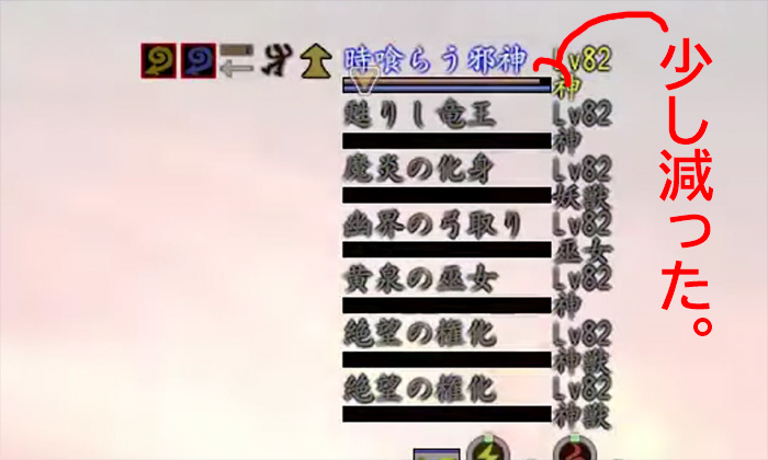 誾千代が攻撃した際、ダメージの数値が出てないのに突然、時喰らう邪神の生命バーが減りました。