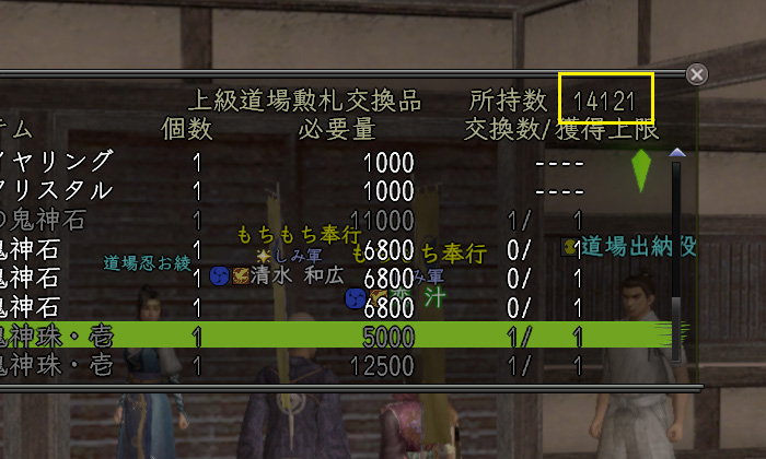 - 上級道場勲札交換(虚空の鬼神石/受継鬼神珠・壱/双継鬼神珠・壱)