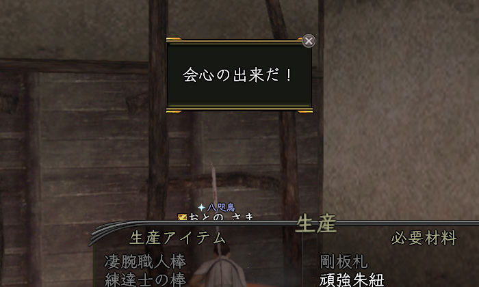 これ、生産してた汁の袋装備が途中まで〝手芸職人〟の職人装備だったんですよ(たすきは〝宝飾職人〟)。たすきノックの際、あまりにも「会心の出来」が出ないもんだから装備を確認し直して気が付きました。
