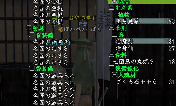 今回は300個ノックして、価値34は全ての装備で大体8個前後出来ました。ただし〝名匠のたすき〟のみは4個。