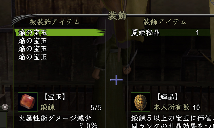 で、今朝はどうだったかというと、基準値の宝玉9個使って〝全属術ダメージ減・参〟が付いたのは1個だけでした。