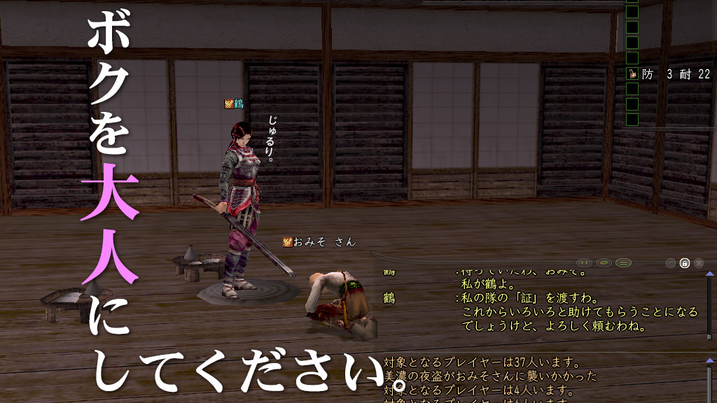 まずは報告を。くーさん(九区流/レベ10鍛冶屋)がしみ軍に入団しました。(リアルが)非常に若い子なので、また見かけたら面倒みてあげてください。
