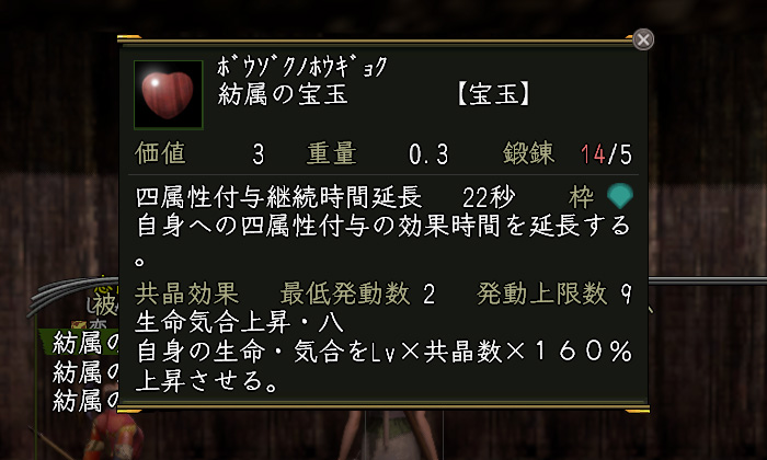 まずはMAX宝玉完成までのつなぎ用に、適当な〝紡属の宝玉〟を準備して生命気合上昇・八を作ります。